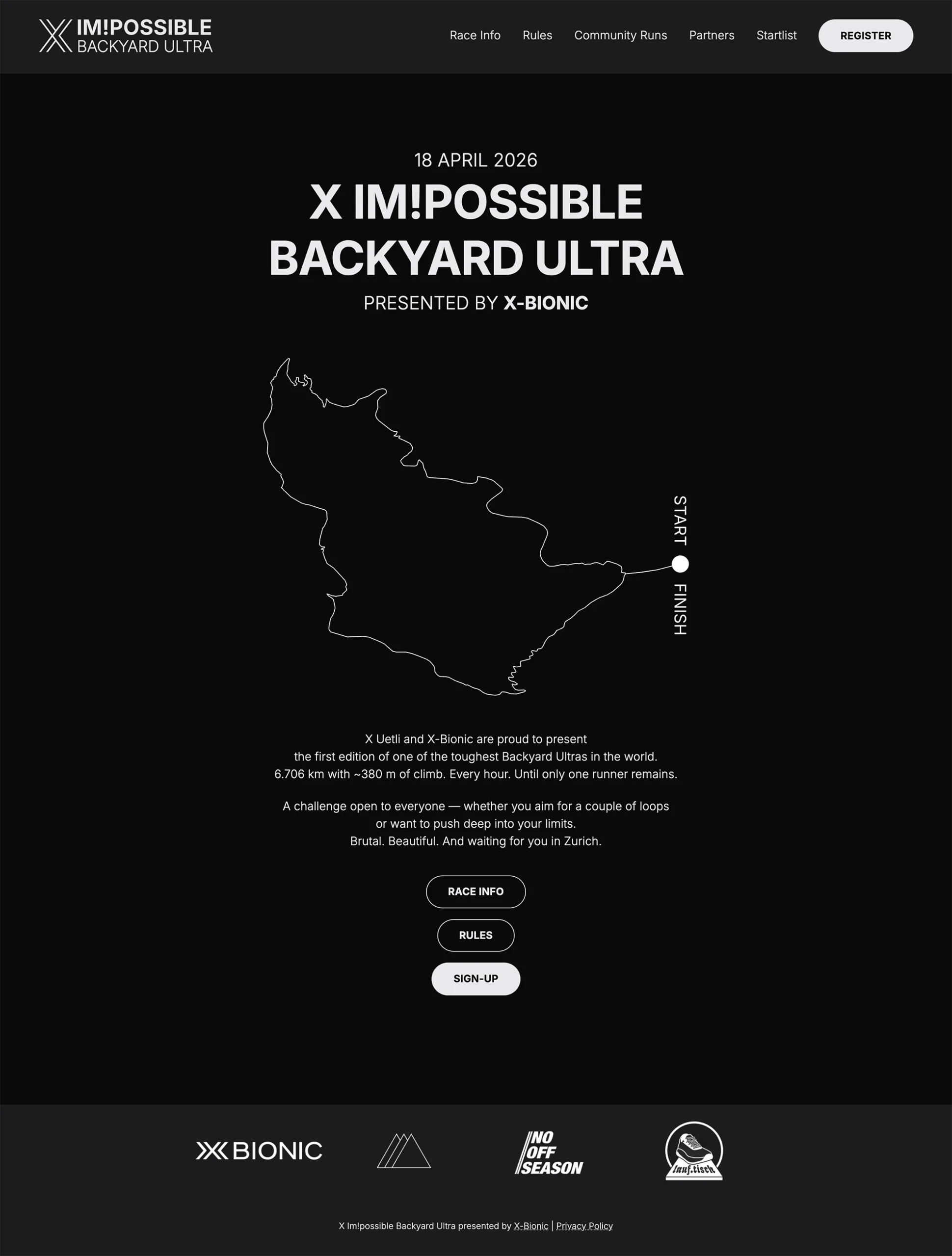 X Im!possible is an official Backyard Ultra race taking place on Zurich’s Uetliberg. The first edition will take place in April 2026, featuring one of the most demanding Backyard loops in the world.